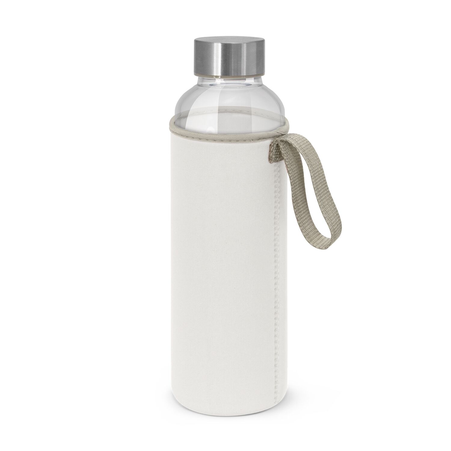 Deluxe 600ml borosilicate glass drink bottle which has an insulating soft neoprene sleeve that keeps drinks cool for longer. The sleeve is accented with grey binding and it has a grey woven carry strap. Both the sleeve and base can be branded in spot colours or stunning full colour. Venus has a secure screw on stainless steel lid which can be laser engraved with a logo. Borosilicate is a lightweight glass that is exceptionally strong and shatter-resistant. Glass is a natural choice for a clean, pure taste and it offers a safe and eco-friendly alternative. This product is not intended to be used with carbonated or hot liquids and is not dishwasher safe. Handwashing is recommended. A production lead time of 20 working days applies to the sleeve by air freight and larger orders can be sea freighted on request to reduce the freight cost.