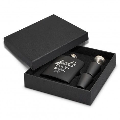 Premium 170ml stainless steel hip flask gift set with two shot glasses and a funnel. It laser engraves to a natural etch and is presented in a black gift box.