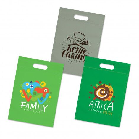 Small heat-sealed tote bag with die cut hand grips which is designed to hold A4 documents and catalogues etc. It is manufactured from 80gsm non-woven polypropylene material.