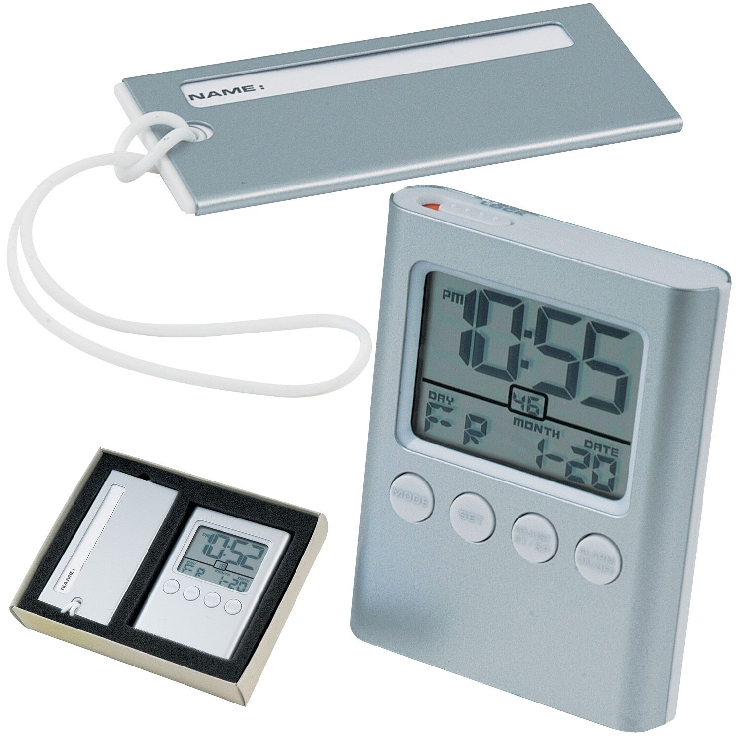 Multi function alarm clock and luggage tag travel set