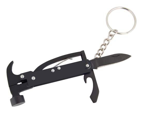 Six function hammer keyring with pouch. Hammer, vice, wire cutter, can opener, screwdriver, knife.