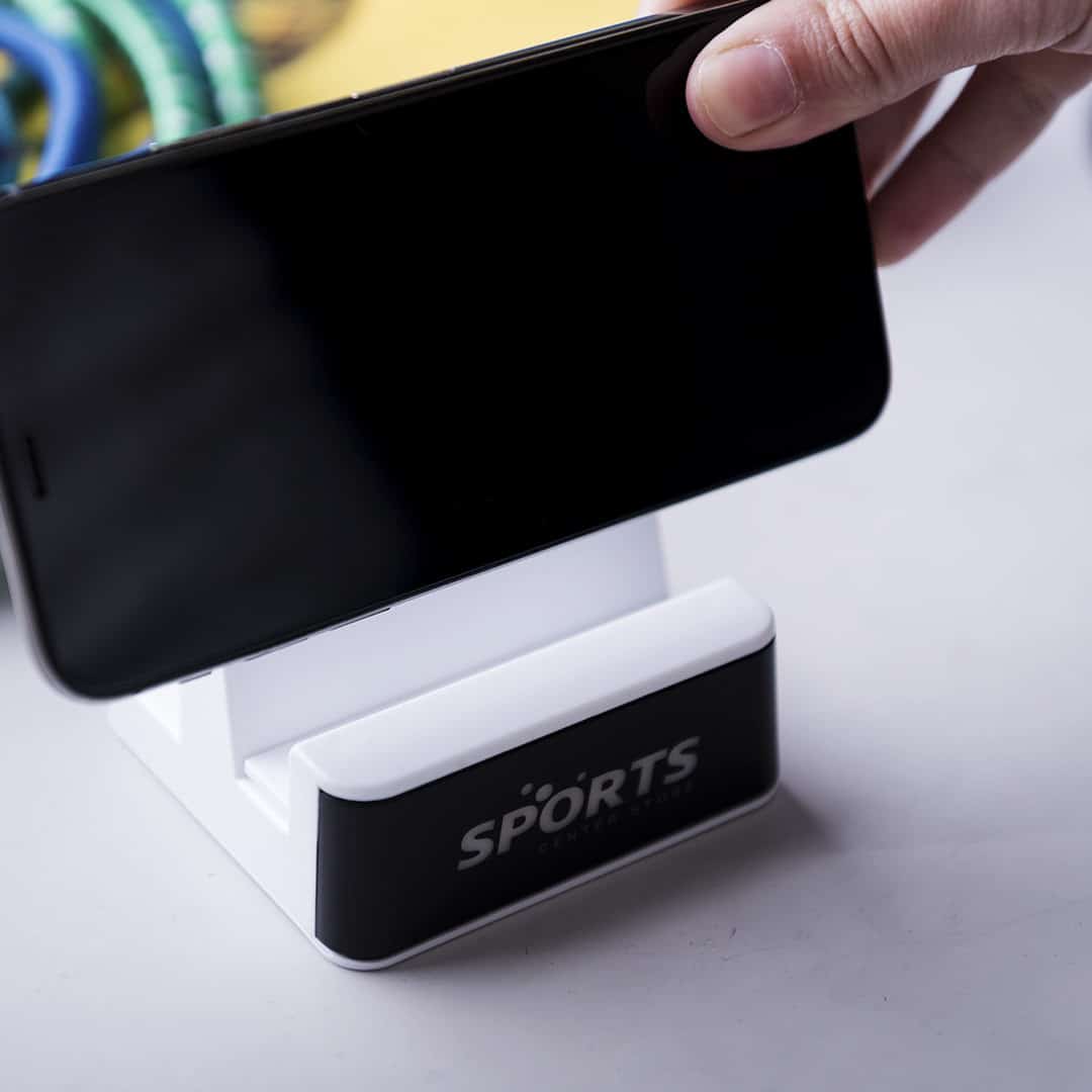 Smartphone/tablet holder in minimalist white color design. With a gadget organizer at the back. Front printing area especially designed for laser engraving, making your logo or brand to be properly illuminated with white light.