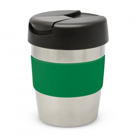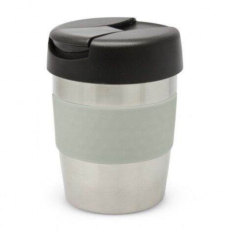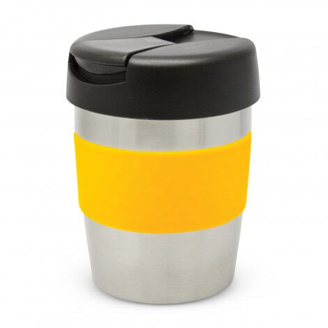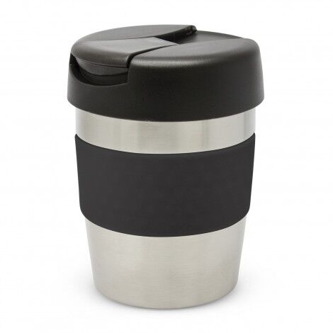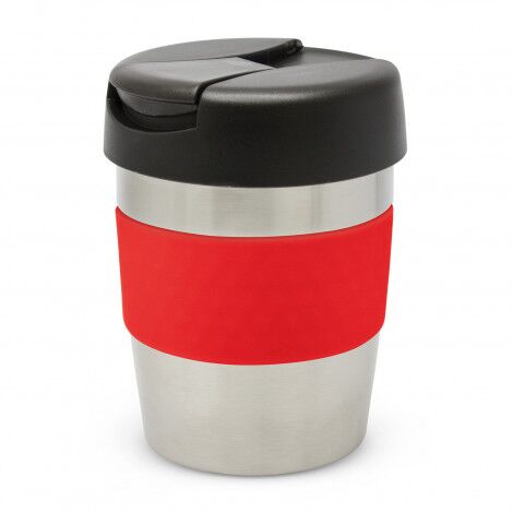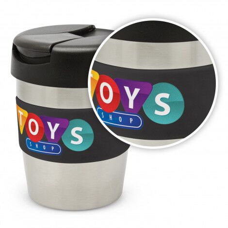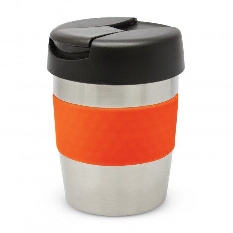 Premium 230ml double wall, vacuum insulated stainless steel cup which will keep drinks hot for up to three hours. It has a soft-touch silicone band and a secure screw on lid with a splashproof flip closure. The cup, lid and band can be mixed and matched in any colour combination from the standard colours at no extra cost. Up to five different colour combinations are included in the price and more are available for an additional charge. Java is BPA-free and is presented in a black gift box. An optional gift tube is available on request. This product is not dishwasher safe and handwashing is recommended.