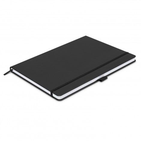 A large-size notebook that has a hardcover with a smart PU finish. It has 96 sheets (192 pages) of 70gsm lined paper, a bookmark ribbon, an elastic closure band and an elastic pen loop.