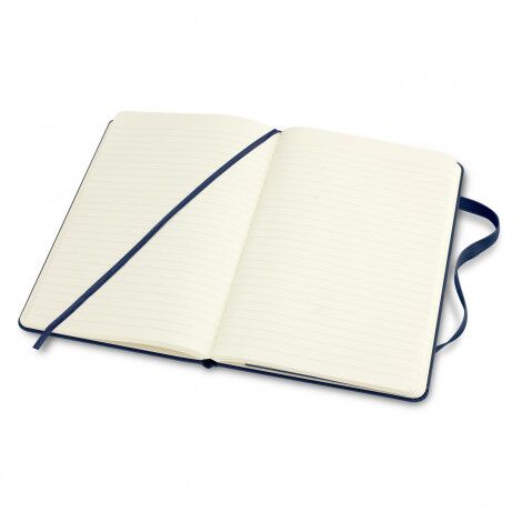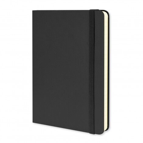 Small enough to fit in any bag, large enough to fit the biggest of ideas. The medium-sized Classic Notebook by Moleskine includes rounded corners to protect against any bumps in the road, and an elastic closure to secure your handwritten thoughts and creative content. The hard cover notebook features 104 leaves (208 pages) of 70gsm Moleskine ivory-coloured lined paper, an elastic closure for privacy, and a bookmark ribbon. The expandable back pocket provides space for storing notes throughout the day and includes the history of Moleskine. A customisable 'In case of loss' notice is printed on the first page, while the Moleskine logo is subtly debossed on the back cover and printed on the inside front cover. Please note this product cannot be supplied without the Moleskine logo. Moleskine reserves the right to decline any custom project or artwork that does not align with their brand on a case-by-case basis.