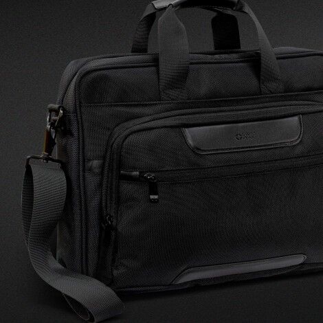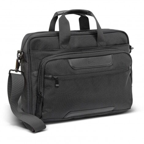Make the daily commute easier and more stylish with the Swiss Peak Voyager Laptop Bag. It is manufactured from premium 1680D polyester fabric with smart PU accents and 210D polyester lining. The large main compartment has a zippered closure and features a padded pocket that will comfortably hold a 15-inch laptop. It has another zippered compartment with two internal slip pockets that offer RFID protection, a pen holder and an external zippered side pocket. The bag has woven carry handles with comfortable PU hand grips, an adjustable and removable shoulder strap with a soft shoulder pad and a rear luggage sleeve that slides over the handle of a rolling suitcase. The Swiss Peak logo is subtly branded on the laptop pocket and is debossed on the front pocket.
