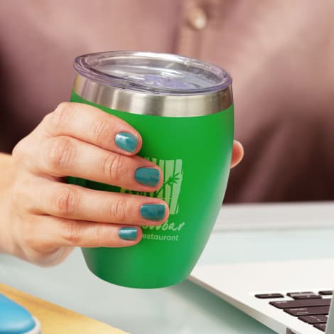 Premium 300ml double wall, vacuum insulated stainless steel coffee cup with a stunning powder coated finish. It has a transparent push on lid and will keep drinks hot or cold for hours. Verona is BPA-free, laser engraves to a shiny steel finish and an optional black gift box is available on request. This product is not dishwasher safe and handwashing is recommended.