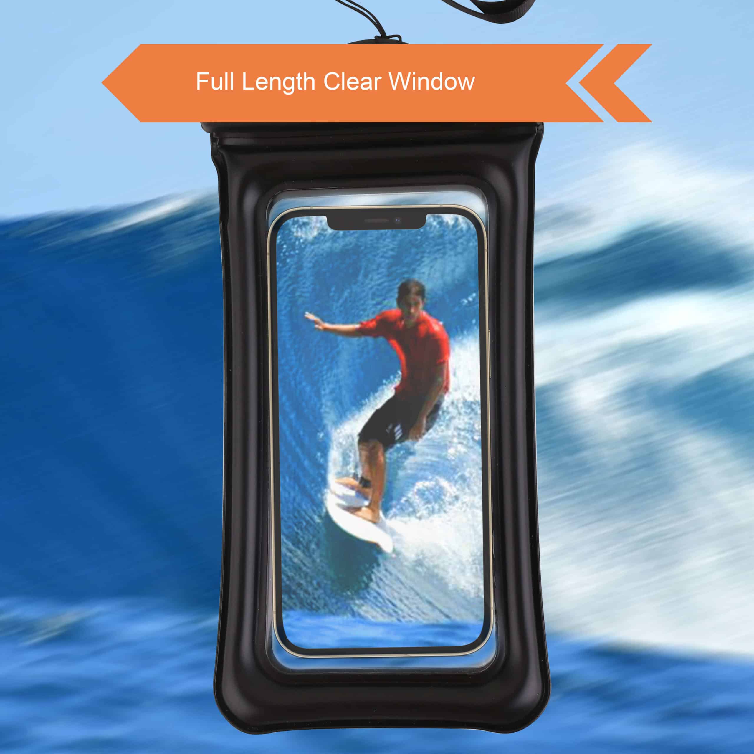 Made from PVC with ABS Strap this floating waterproof phone cover measures 220cm x 115cm. The dual swivel lock and sealable closure clip design is ideal for beach, kayaking, diving, swimming, fishing and hiking and outdoor water activities. The underwater case dry bag has an ultra crystal clear window on both sides allowing full touch screen access and ability to take photos,send texts, make and receive calls . Professional certification of IPX8, the waterproof cellphone dry bag provides waterproof / dirtproof protection for your smartphones, credit card, wallet, money.